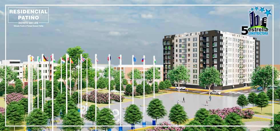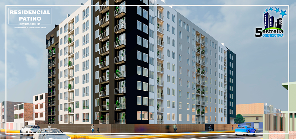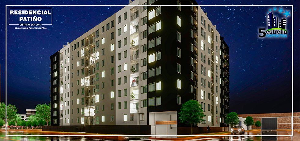 RESIDENCIAL PATIÑO proyecto de CONSTRUCTORA CINCO ESTRELLA, Empresa que durante estos 14 años nos hemos consolidado en ventas inmobiliarias, asi mismo nos caracterizamos por nuestras infraestructuras, diseños, y acabados brindando satisfacción al cliente, trabajamos con altas exigencias de calidad y eficacia, informando semanalmente a nuestro clientes los avances de la obra mediante fotos y vídeos brindando así confianza seguridad y compromiso no solo en nuestras infraestructuras si no en una atención más personalizada. Nuestro proyecto cuenta con una arquitectura moderna, estructura de concreto armado de soporte anti-sísmico que contara con seguridad en la sala de Recepción. Asimismo, cuenta con intercomunicador, ascensor con acceso a los estacionamientos, elevador para personas con discapacidad contamos con sistemas de alarmas y contra incendios, entre otros equipamientos.